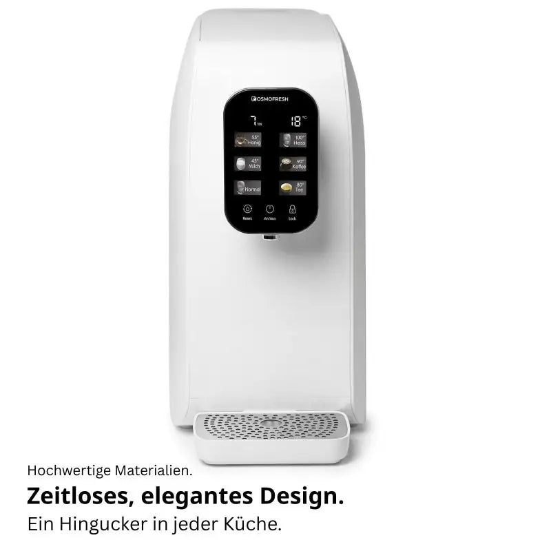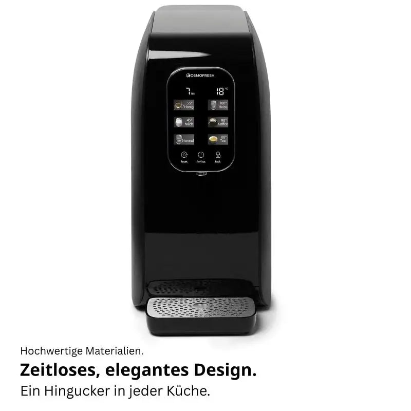 Steuerung über HD Touchscreen. Erinnerungen an Filterwechsel, Anzeige von Wasserqualität und -temperatur, einfache Wasserentnahme und Tankkontrolle. Ein-/Ausschalten per Touch.