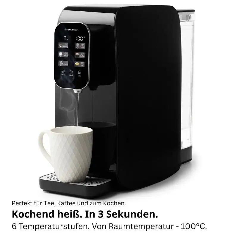 Der integrierte Durchlauferhitzer der Quella Life bringt Wasser in nur 3 Sekunden zum Kochen. Über das Touch Display können sechs verschiedene Temperaturstufen gewählt werden: